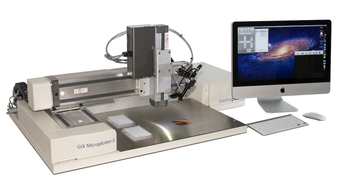 The SonoPlot® Microplotter II is a precision picoliter fluid dispensing system for the microarray and polymer electronics markets with significant advantages over existing products in deposited feature size and type, regularity of volumes dispensed, and flexibility for the user.