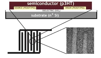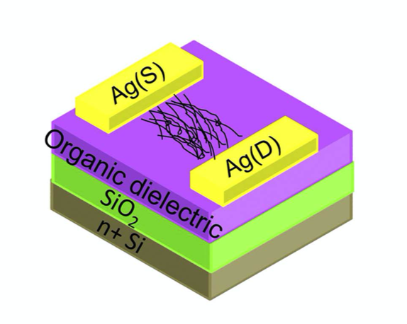 Organic electronic devices, like field-effect transistors (FETs) or switches, have received extensive attention because of their potential application in flexible electronics, large-area displays, radio-frequency identification tags (RFIDs), sensors, etc. Crucial advantage of organic electronics rests in a prospect of low cost manufacturing of electronic circuits achievable by deposition of electronic components from solution by, e.g, ink-jet printing and spray coating. The printing is desirable in the case of fine structures like interdigitated electrodes while spray brushing is more effective for fabrication of large area thin films.
