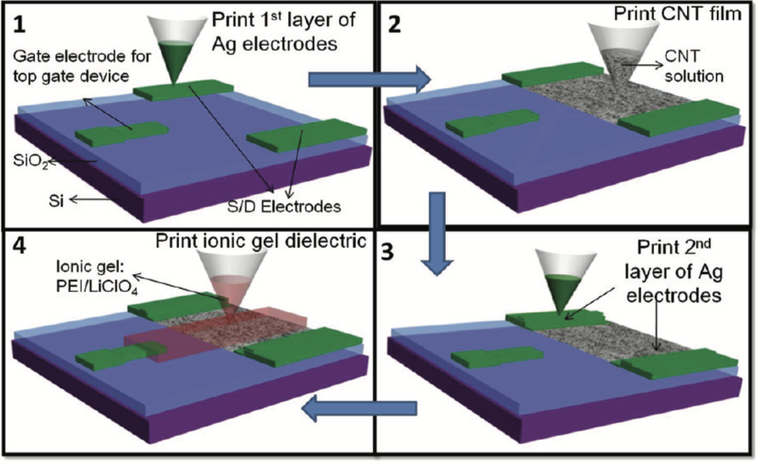 Solution Processable Transistors and Switches: Plotter Printing and Spray Deposition of Materials
