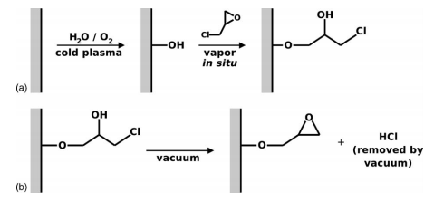 The second technology we present is a process that uses a cold plasma and a subsequent in vacuo vapor-phase reaction to terminate a variety of oxide surfaces with epoxide chemical groups. These epoxide groups can react with amine-containing biomolecules, such as proteins and modified oligonucleotides, to form strong covalent linkages between the biomolecules and the treated surface. The use of a plasma activation step followed by an in vacuo vapor-phase reaction allows for the precise control of surface functional groups, rather than the mixture of functionalities normally produced. By maintaining the samples under vacuum throughout the process, adsorption of contaminants is effectively eliminated. This process modifies a range of different oxide surfaces, is fast, consumes a minimal amount of reagents, and produces attachment densities for bound biomolecules that are comparable to or better than commercially available substrates.