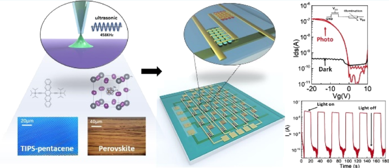 The crystallization of organic or perovskite semiconductors reflects the intermolecular interactions and crucially determines the charge transport in opto-electronic devices. In this report, we demonstrate and investigate the use of an ultrasonicated dispenser to guide the formation of crystals of organic and perovskite semiconductors. The moving speed of the dispenser affects the match between the concentration gradient and evaporation rate near the three-phase contact lines and thus the generation of various crystallization morphologies. The mechanism of crystallization is given by a relationship between the calculated concentration gradient profile and the degree of crystal alignment. Highly ordered, aligned crystals are achieved for both organic bis(triisopropylsilylethynyl)-pentacene and perovskite MAPbI3 semiconductors. Absorption spectra, Raman scattering spectroscopy analysis, and grazing incidence wide-angle X-ray scattering measurement reveal the strong anisotropy of the crystalline structures. The aligned crystals lead to remarkably enhanced electrical performances in an organic thin-film transistor (OTFT) and perovskite photodetector. As a demonstration, we combine the OTFT with photodetectors to achieve an active matrix of normally off, gate-tunable photodetectors that operate under ambient conditions.