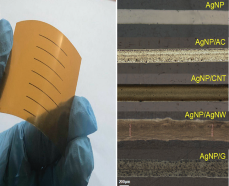 Printed flexible electrodes with conductive inks have attracted much attention in wearable electronics, flexible displays, radio-frequency identification, etc. Conventional conductive inks contain large amount of polymer which would increase the electrical resistivity of as-printed electrodes and require high sintering temperature. Here, composite electrodes without cracks were printed on polyimide substrate using binder-free silver nanoparticle based inks with zero-dimensional (activated carbon), one-dimensional (silver nanowire and carbon nanotube) or two-dimensional (graphene) fillers. The effect of fillers on resistivity and flexibility of printed composite electrodes were evaluated. The graphene filler could reduce the resistivity of electrodes, reaching 1.7 × 10−7 Ω·m after low power laser sintering, while the silver nanowire filler improved their flexibility largely during bending tests. The microstructural changes were examined to understand the nanojoining process and their properties.