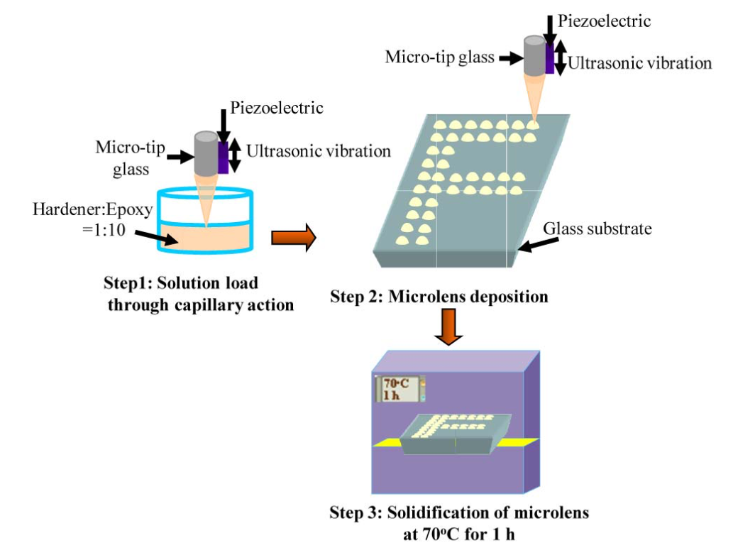 The fabrication of high quality and low cost microlenses on a glass substrate using a simple, rapid, and precise direct microplotting technique is shown in this paper. The fabrication method is based on the use of a microplotter system, which is significantly different from the existing inkjet, roll-to-roll printing, and reactive ion etching technology and could work with higher viscosity materials. By optimizing the param- eters of voltage, dispense time, and concentration of the polymer solution, high quality microlenses with a diameter of 20 μm could be obtained. The geometrical and optical characteristics of the microlenses are analyzed by measurement of the surface profile and the imaging properties in the near-field and far-field zones as well as the diffraction pattern. We think that the fabricated microlenses could be attractive for enhancing the light extraction efficiency of light emitting diodes.