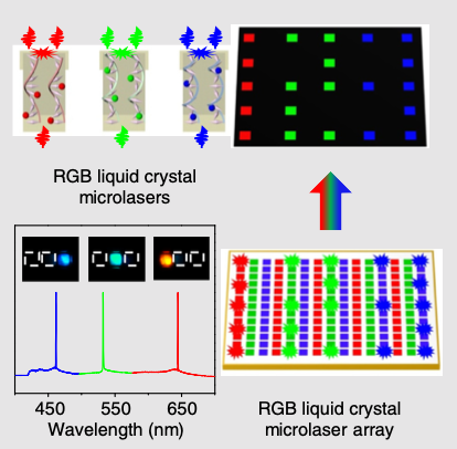Laser displays, benefiting from the characteristic merits of lasers, have led to the revolution of next-generation display technologies owing to their superior color expression. However, the acquisition of pixelated laser arrays as self-emissive panels for flat-panel laser displays remains challenging. Liquid crystal (LC) materials with excellent processability and optoelectronic properties offer considerable potential for the construction of highly ordered multicolor laser arrays. Here, we demonstrate flat-panel laser displays on LC microlaser pixel arrays through a microtemplate-assisted inkjet printing method. Individual organic red-green-blue (RGB) microlaser pixel arrays were obtained by doping dyes into LCs with photonic band edges to obtain single-mode RGB lasing, leading to a much broader color gamut, compared with the standard RGB color space. Then we acquired periodically patterned RGB pixel matrices by positioning LC microlasers precisely into highly ordered arrays, according to the well-organized geometry of the microtemplates. Subsequently, we demonstrated full-color flat-panel laser displays using the LC microlaser pixel matrices as self-emissive panels. These results provide valuable enlightenment for the Introduction Laser displays take advantage of high monochromaticity and brightness of laser emissions. They have emerged as revolutionary technologies in the display industries DOI: 10.31635/ccschem.020.202000162 CCS Chem. 2020, 2, 369–375 construction of next-generation flat-panel laser dis- play devices.
