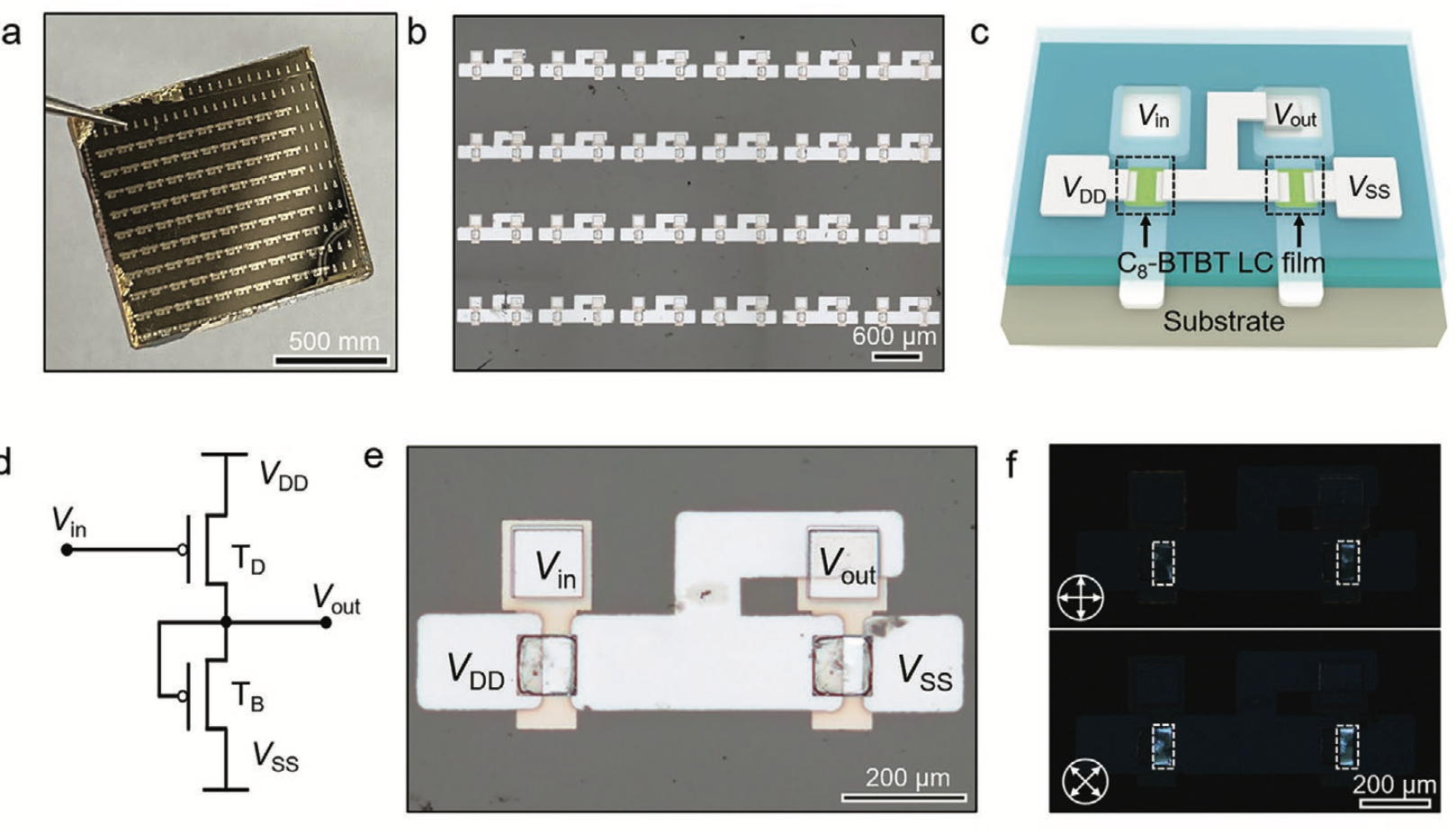 of the LC materials to form high-quality LC films with large grain sizes. This approach enables to achieve patterned growth of high-quality 2,7-dioctyl[1]- benzothieno[3,2-b][1]benzothiophene (C8-BTBT) LC films. The patterned C8-BTBT LC film-based 7 × 7 OFET array has 100% die yield and shows high average mobility of 6.31 cm2 V−1 s−1, along with maximum mobility up to 9.33 cm2 V−1 s−1. As a result, the inverters based on the patterned LC films reach a high gain up to 23.75 as well as an ultrahigh noise margin over 81.3%. Given the good generality of the patterning process and the high quality of the resulting films, the proposed method paves the way for high-performance organic integrated devices.